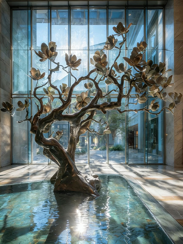 Moderno vestíbulo del hotel, oficina de ventas, decoración suave, adornos de metal, casa club, sala de estar, pasillo, escultura de árbol de acero inoxidable, personalización