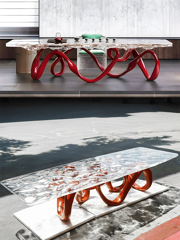 This custom art table is a signature piece that seamlessly combines Contemporary Sculptural Art with Functional Furniture. The tabletop is handcrafted from Transparent Resin, while the base features a bold Red Abstract Sculptural Form, creating a strong visual contrast and a dynamic sense of movement. The result is a striking focal point within any space.